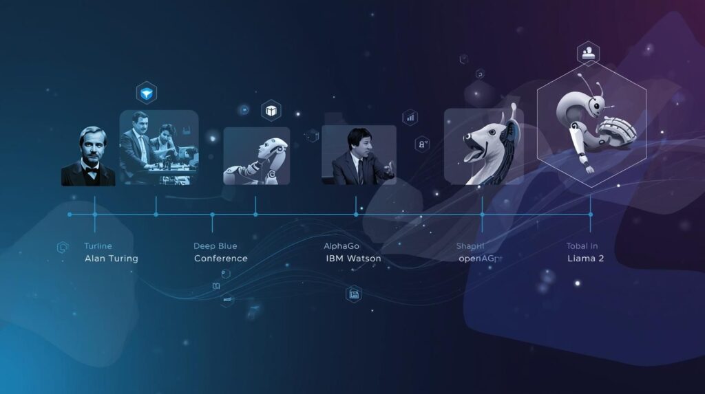 Milestones include Deep Blue vs Kasparov, IBM Watson, and AlphaGo by DeepMind. Today, innovation continues through OpenAI, Llama 2, and large-scale systems powered by Cloud computing and Big data, marking a new AI era in 2026.