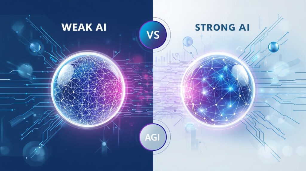 In contrast, Strong AI (Artificial General Intelligence – AGI) remains theoretical. AGI would learn, reason, and adapt across domains like a human. While research continues, no existing system has reached this level of general intelligence.